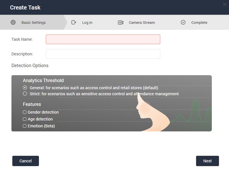 QVR Face 将为指定的 QVR Pro 摄像头流创建实时分析任务。