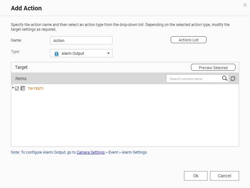QVR Pro 利用“Alarm Output”(警报输出)功能来触发摄像头的数字输出。