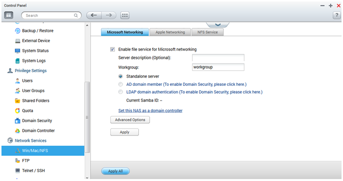 请先以管理者账号登录NAS。切换至[控制面板]>[网络服务]>[Win/Mac/NFS]>[微软网络]之后,点击[启用微软网络服务]。
