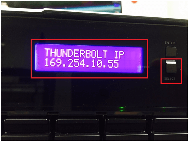 在Thunderbolt NAS的面板上按下[Select]键来查知Thunderbolt的IP地址。