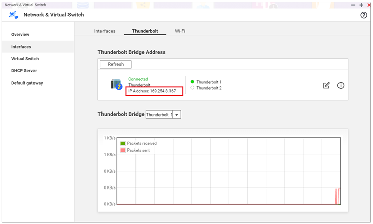 以管理者账号登录NAS。切换至[主菜单]>[网络与虚拟交换机 Network & Virtual Switch]>[网络适配器]之后,请点击[Thunderbolt]即可得知您的Thunderbolt IP地址。