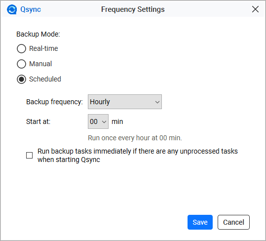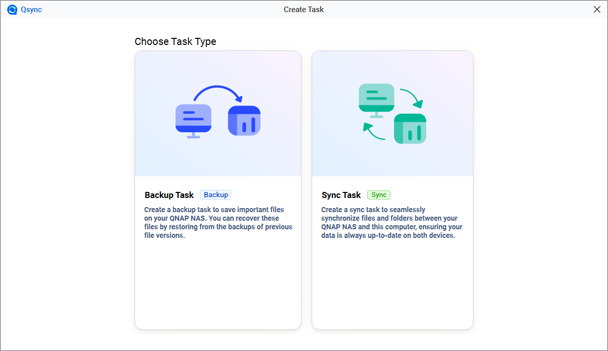 首次设置 Qsync Client 时,系统将提示您选择所需的任务类型。同步任务可用于创建配对文件夹,使本地文件夹和 NAS 保持同步。备份任务可用于指定您的计算机上要备份到 NAS 的本地文件夹。有关如何创建每种任务的详细说明,请参见下文中的“创建同步任务”和“创建备份任务”主题。