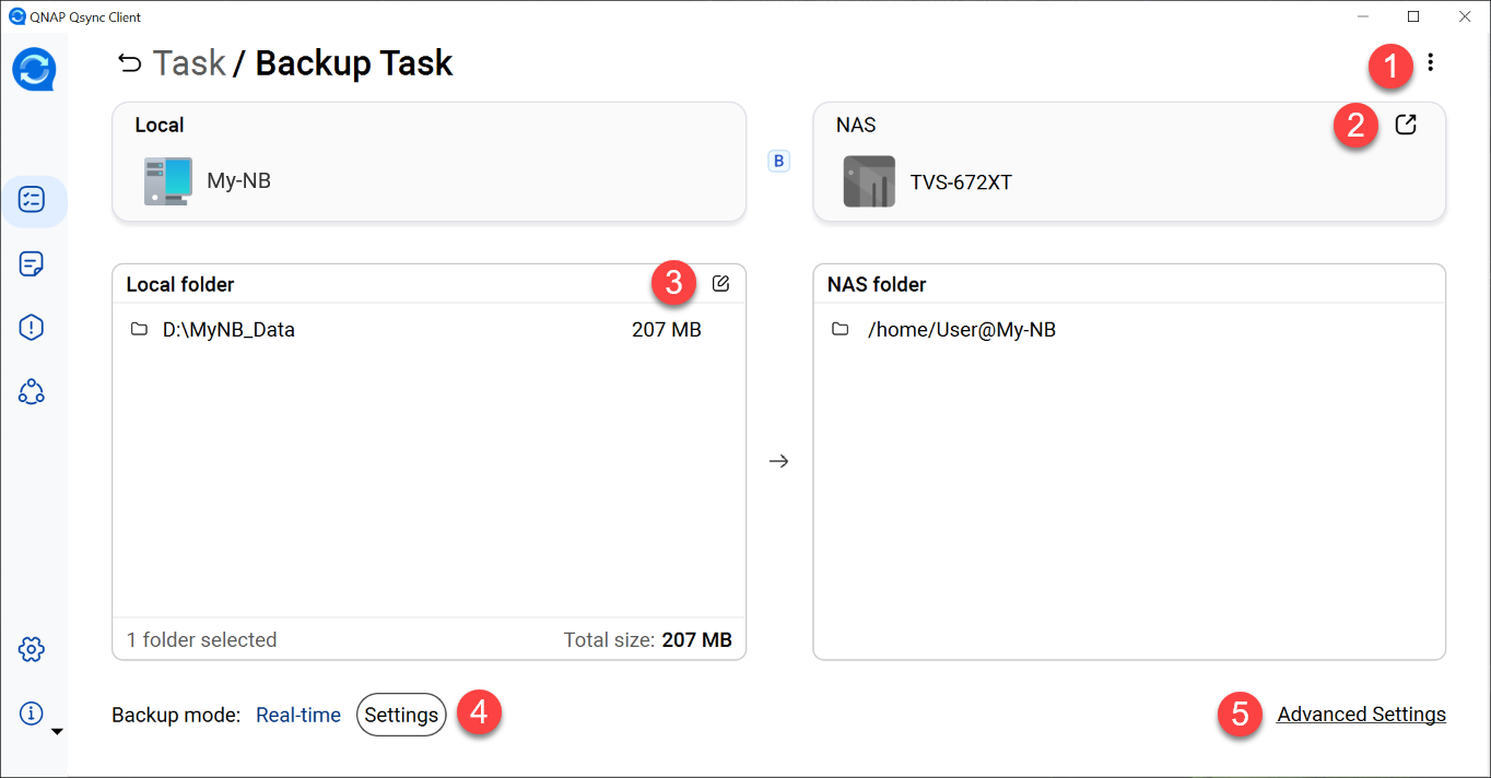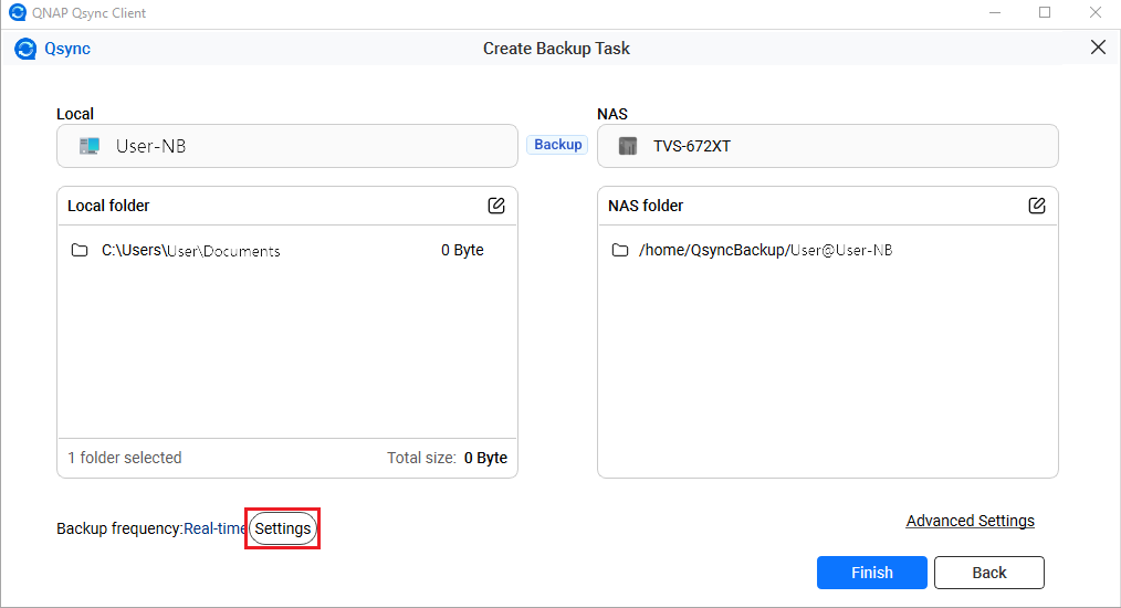 - 选择本地文件夹(备份源)和 NAS 文件夹(备份目标)。
