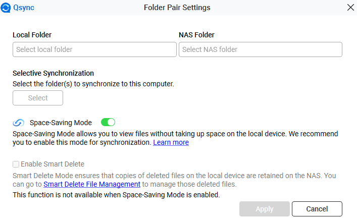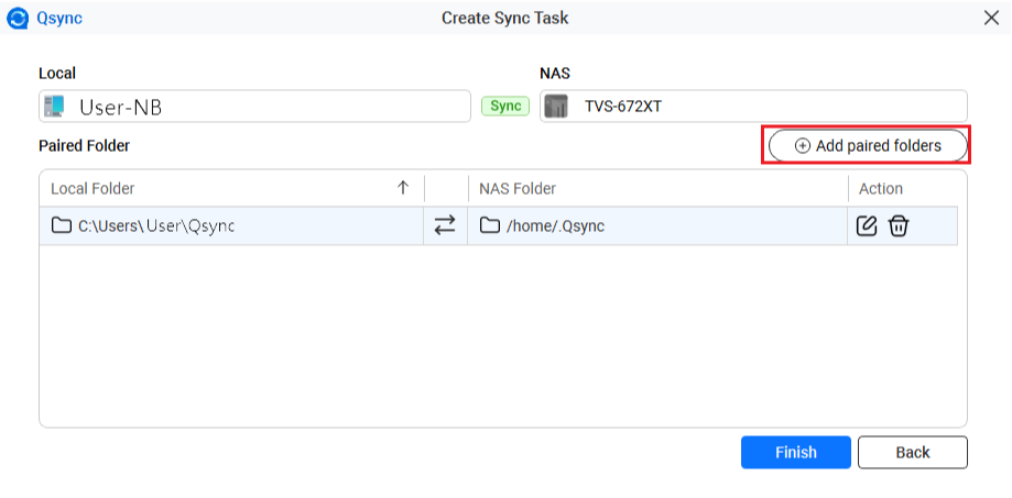 此时会出现文件夹对设置窗口。 - 选择本地文件夹和 NAS 文件夹。