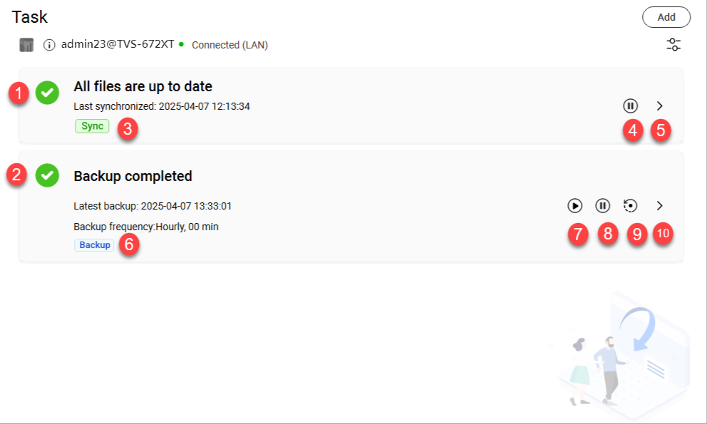 7 | 添加新的备份或同步任务。 | 单击添加。 此时会打开创建任务窗口。 |