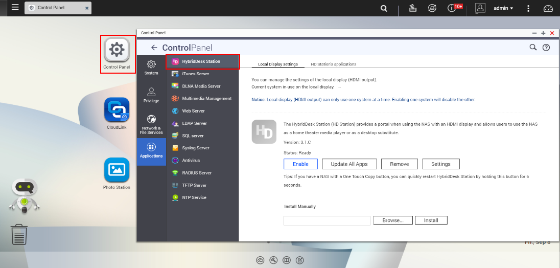 - 转到“Control Panel”(控制台)>“Applications”(应用程序)>“HybridDesk Station”。