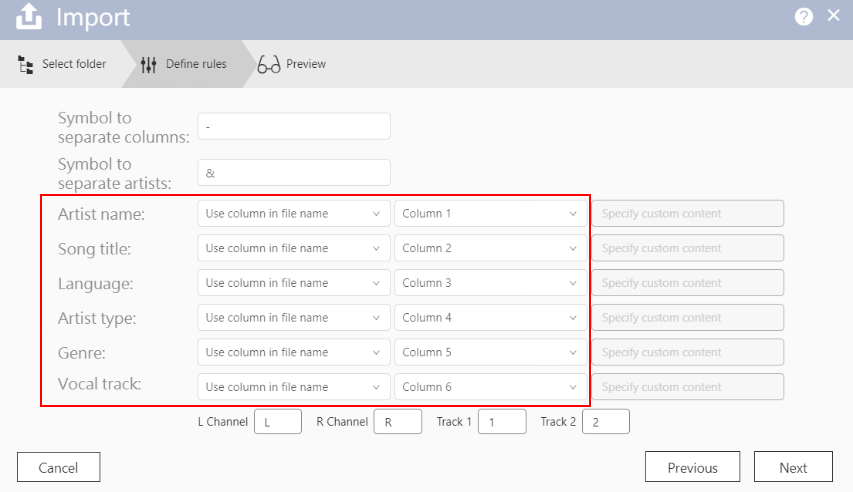 - Use column in file name(使用文件名中的列):选中此选项时,OceanKTV 在此部分中使用文件名中提供的信息。您需要指定信息在文件名中的位置。
