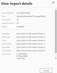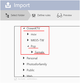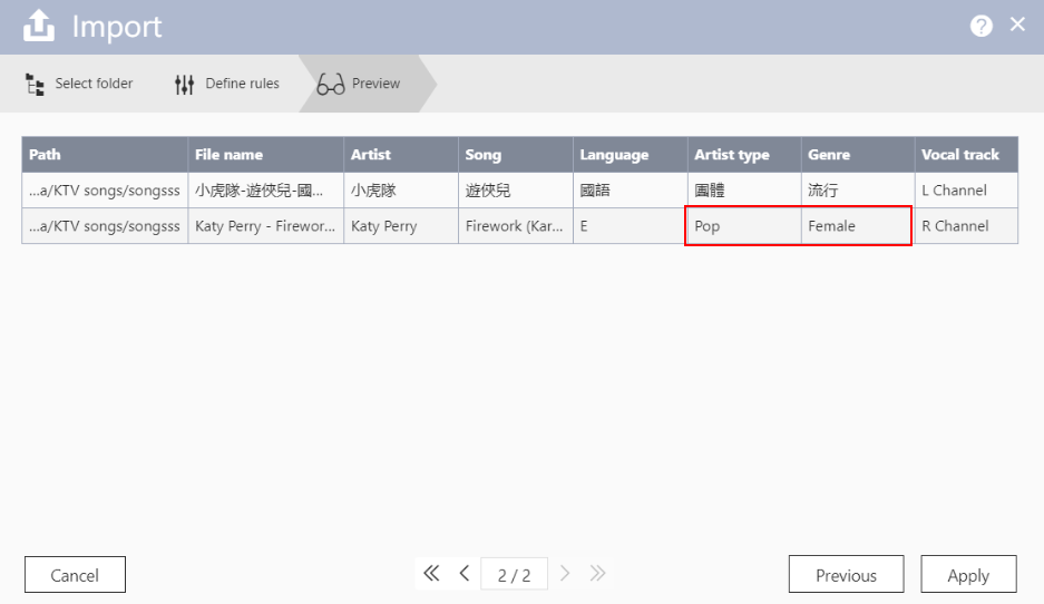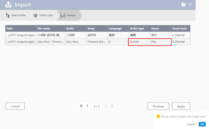 例如,您可以使用文件夹名称和父文件夹名称指定音乐类型和歌手类型。如果文件路径为“OceanKTV/Pop/Female”,文件名为 Adele-Hello-English,则导入完成后,Pop 将成为音乐类型,Female 为歌手类型,Adele 为歌手姓名,Hello 为歌曲名称,English 为语言。