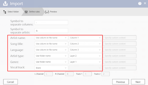 例如,如果您歌曲的文件名是 Adele-Hello-English-female-pop-L,使用连字符 (-) 作为不同列的分隔符,导入完成后,Adele 将成为歌手姓名、Hello 为歌曲名称、English 为语言、female 为歌手类型、pop 为音乐类型、L 为人声。