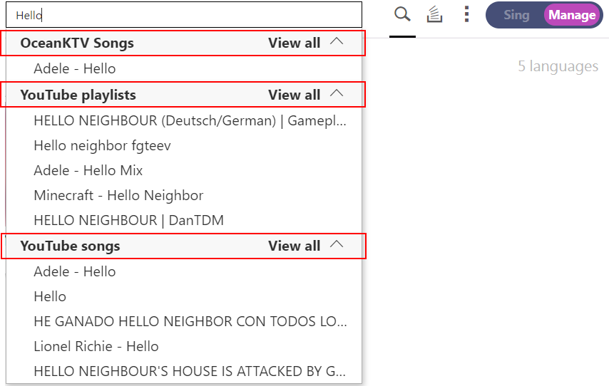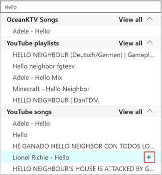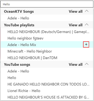 OceanKTV 为每个类别列出五个搜索结果(如果有)。您可以单击“View all”(查看全部)以查看更多结果。要添加歌曲,请单击歌曲或播放列表旁边的“+”。