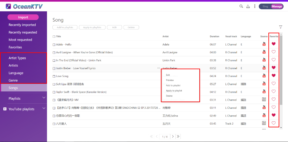 - Preview(预览):如果歌曲是从 YouTube 导入的,OceanKTV 将打开原始 YouTube 页面;如果歌曲是本地导入的;OceanKTV 将直接播放视频。