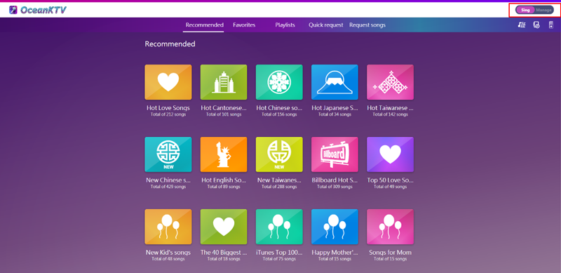 在此部分,您可以快速点播已导入 OceanKTV 的歌曲和在 YouTube 上找到的歌曲。 - “To be played”(待播歌曲)、“Played”(已播歌曲)和“Remote Control”(远程控制)
