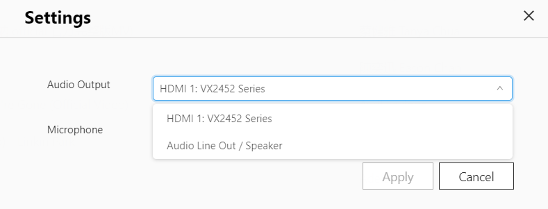 将您的音频设备连接到 NAS 上的 HDMI 端口。单击右上角的 ,然后选择“Settings”(设置)。在“Audio Output”(音频输出)中,为音频输出选择设备,然后单击“Apply”(应用)。