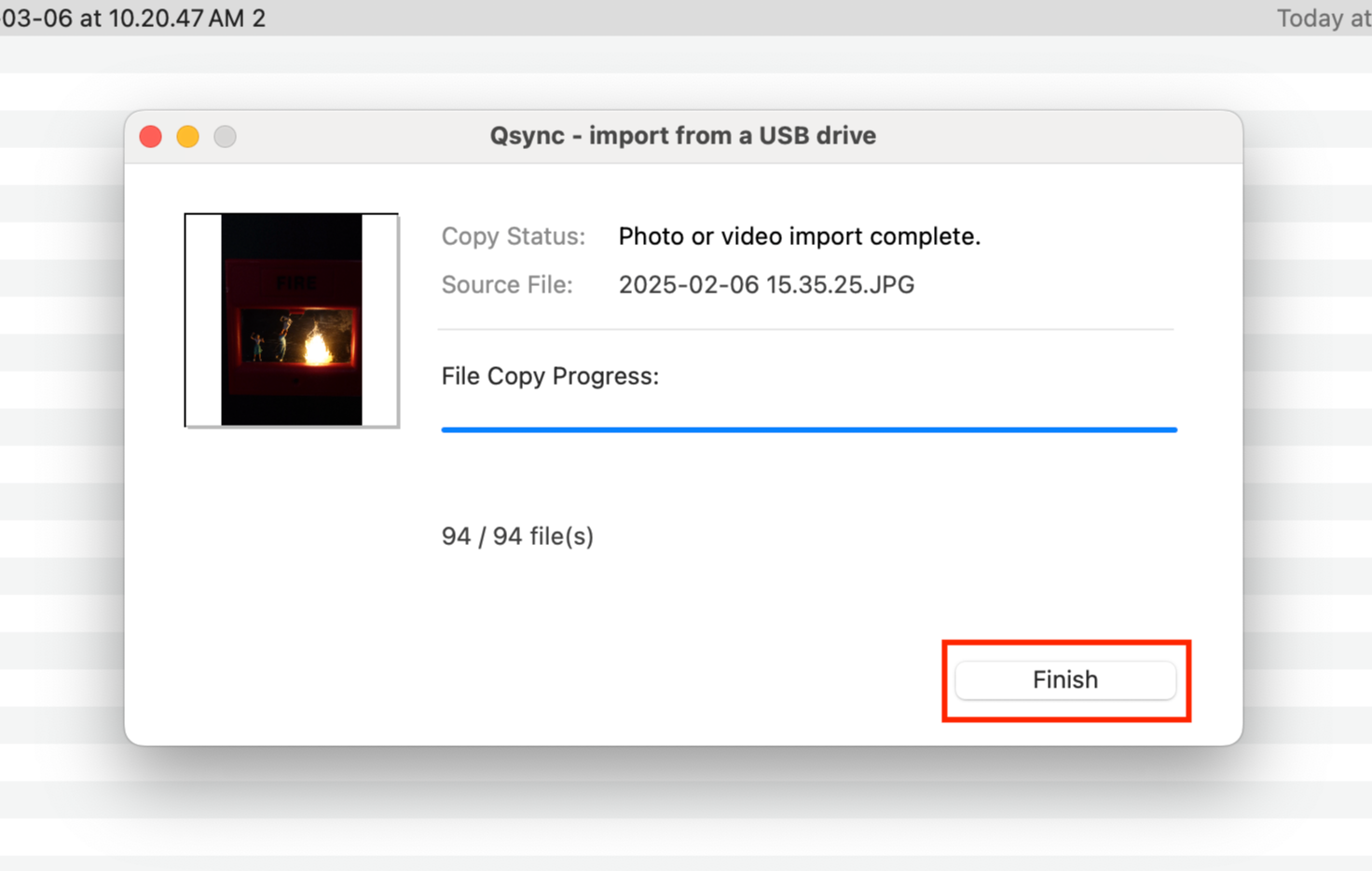 Qsync starts uploading your files to the selected NAS folder. The pop-up window displays the upload progress. - When the upload is finished, click Finish.