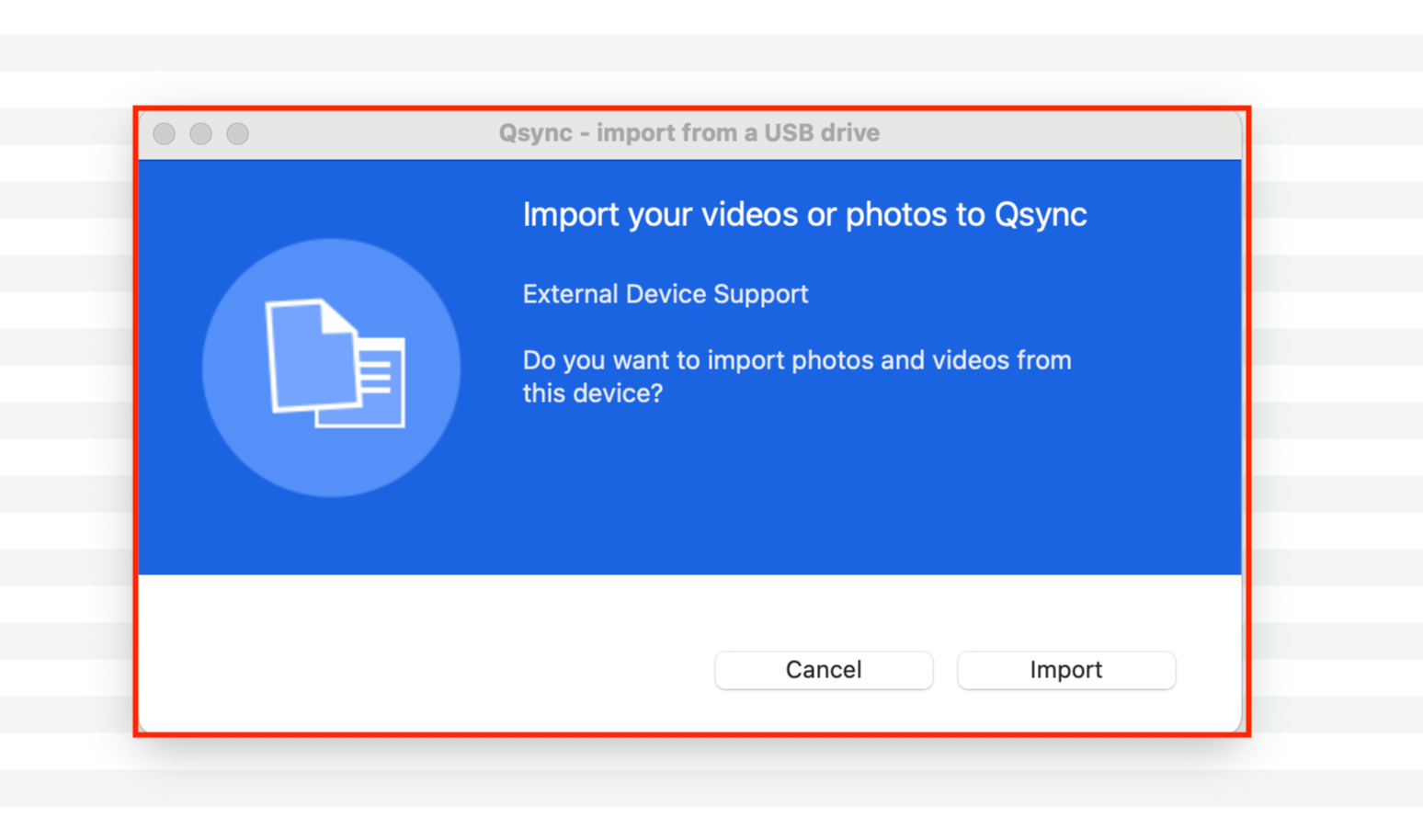 Qsync Client automatically detects the storage device and a Qsync pop-up window appears asking you if you want to import your files.