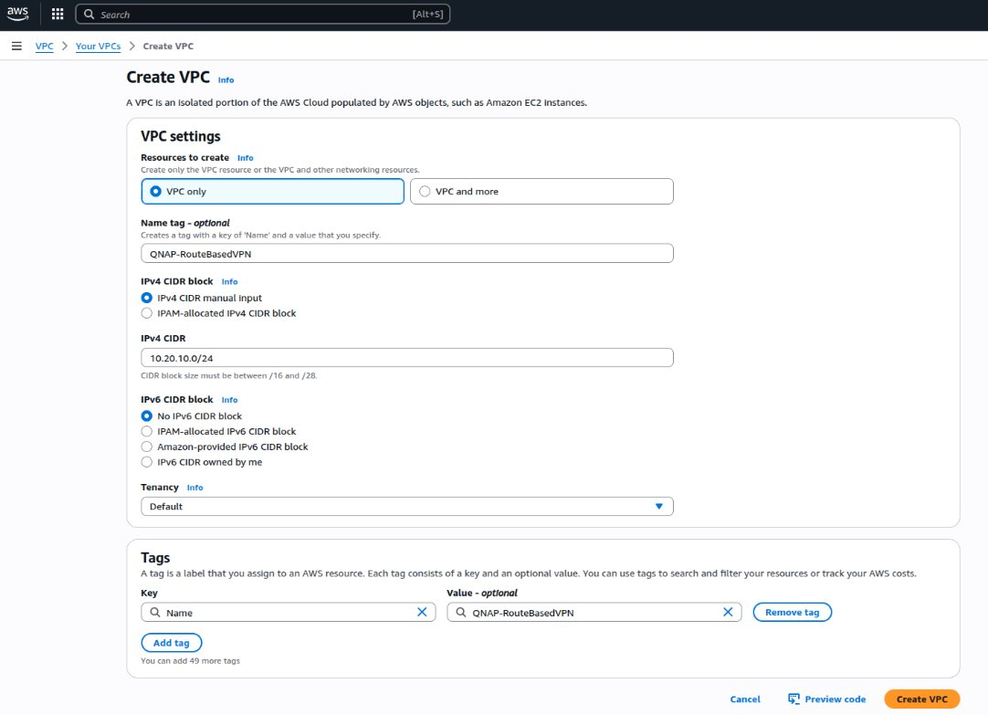 The Create VPC page appears. - Under VPC settings, select VPC only.