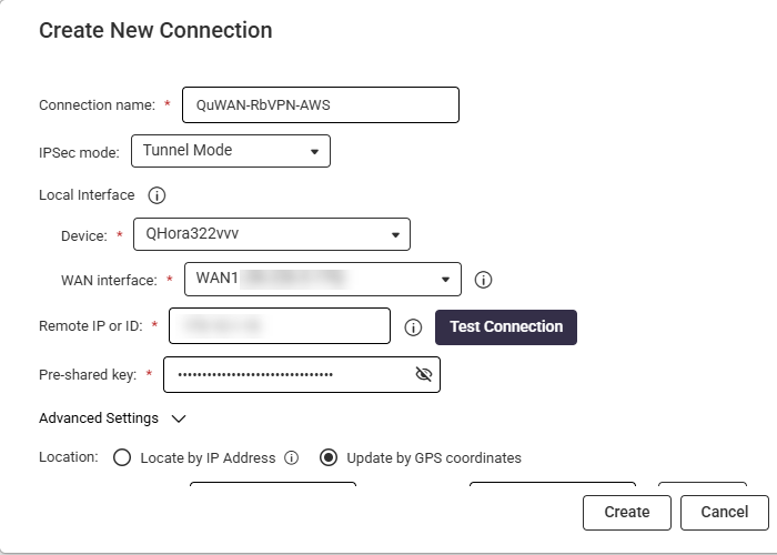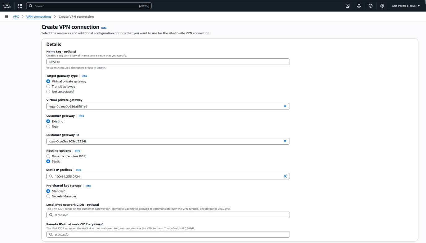 field. - Optional: Configure the pre-shared key storage, local IPv4 network CIDR, remote IPv4 network CIDR fields.