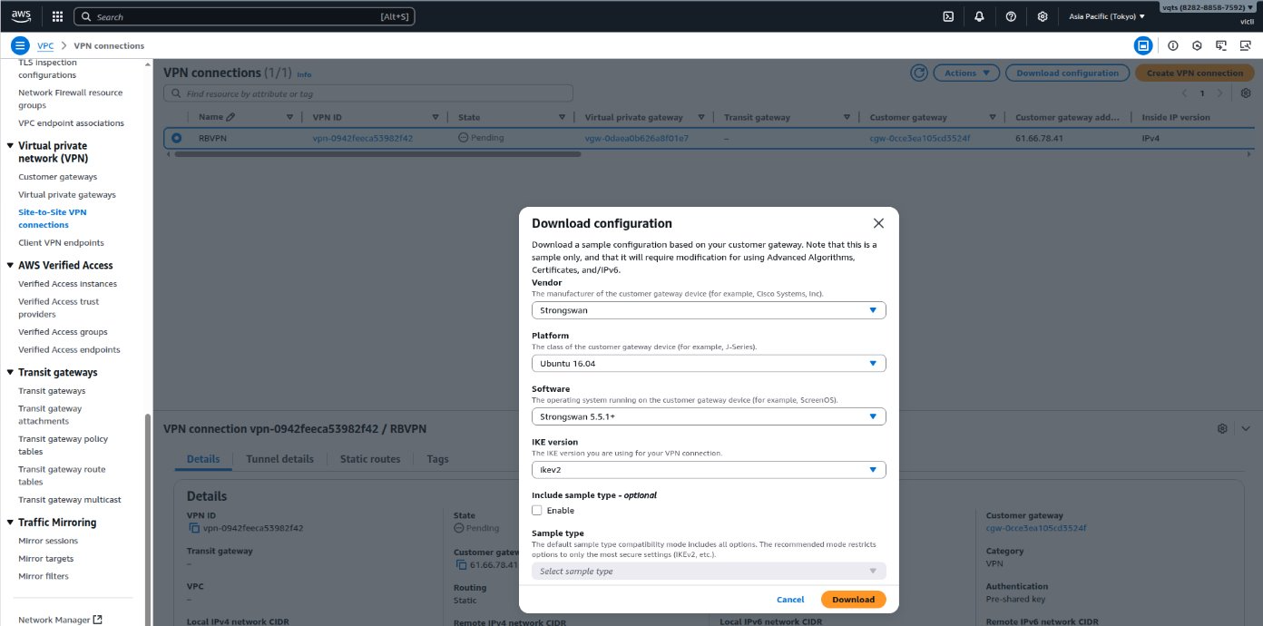- On the VPC dashboard side panel, go to Virtual private network (VPN) > Site-to-site VPN connections.