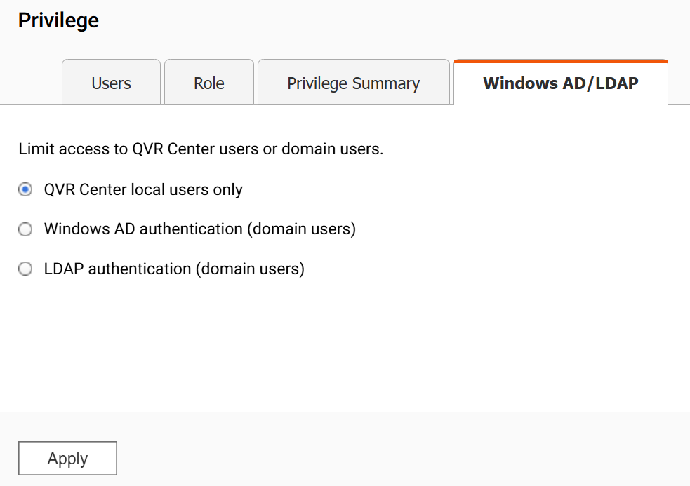QVR Center supports adding domain users through an Active Directory (AD) or Lightweight Directory Access Protocol (LDAP) server. This allows administrators to manage user access more efficiently and securely by integrating with their existing authentication system.