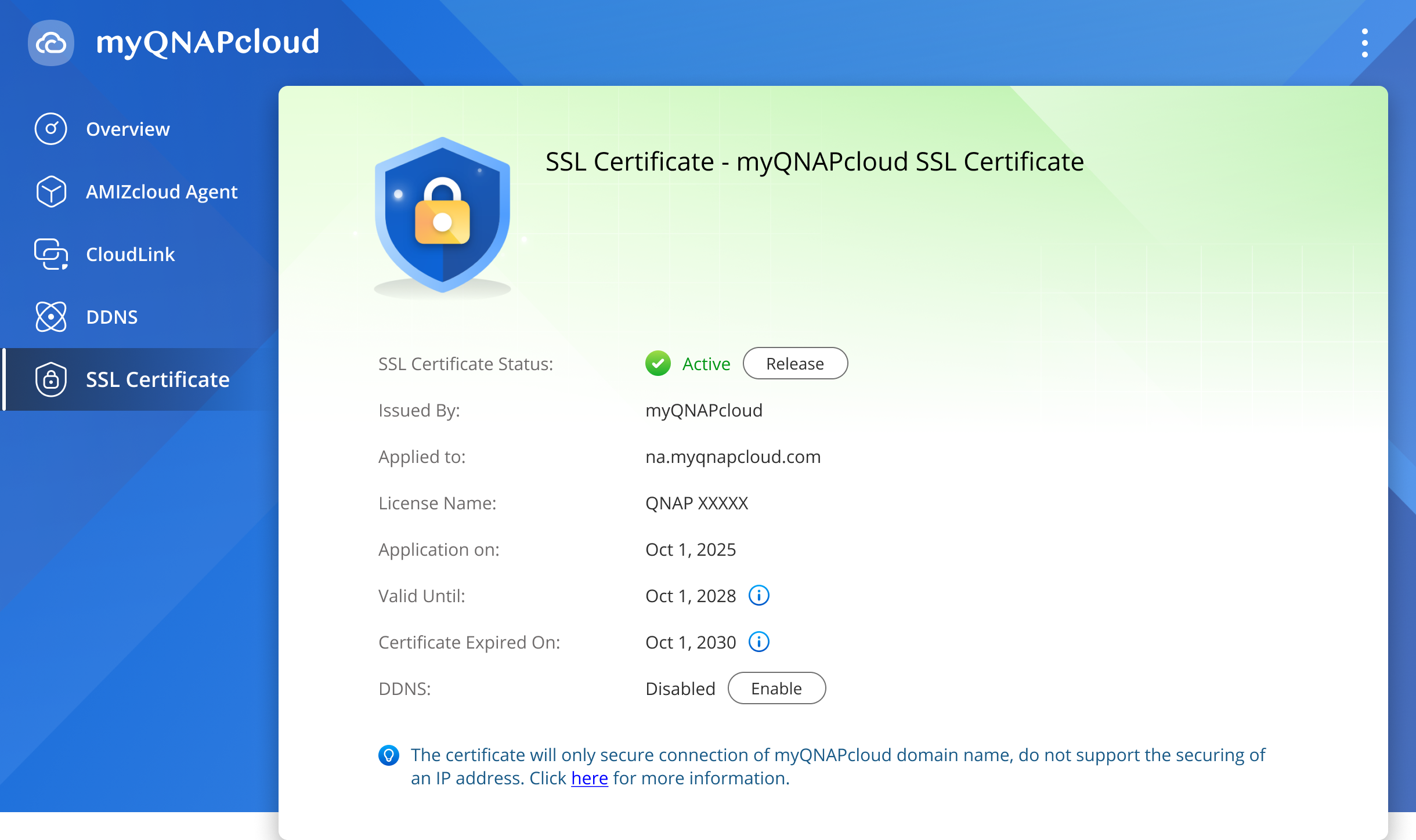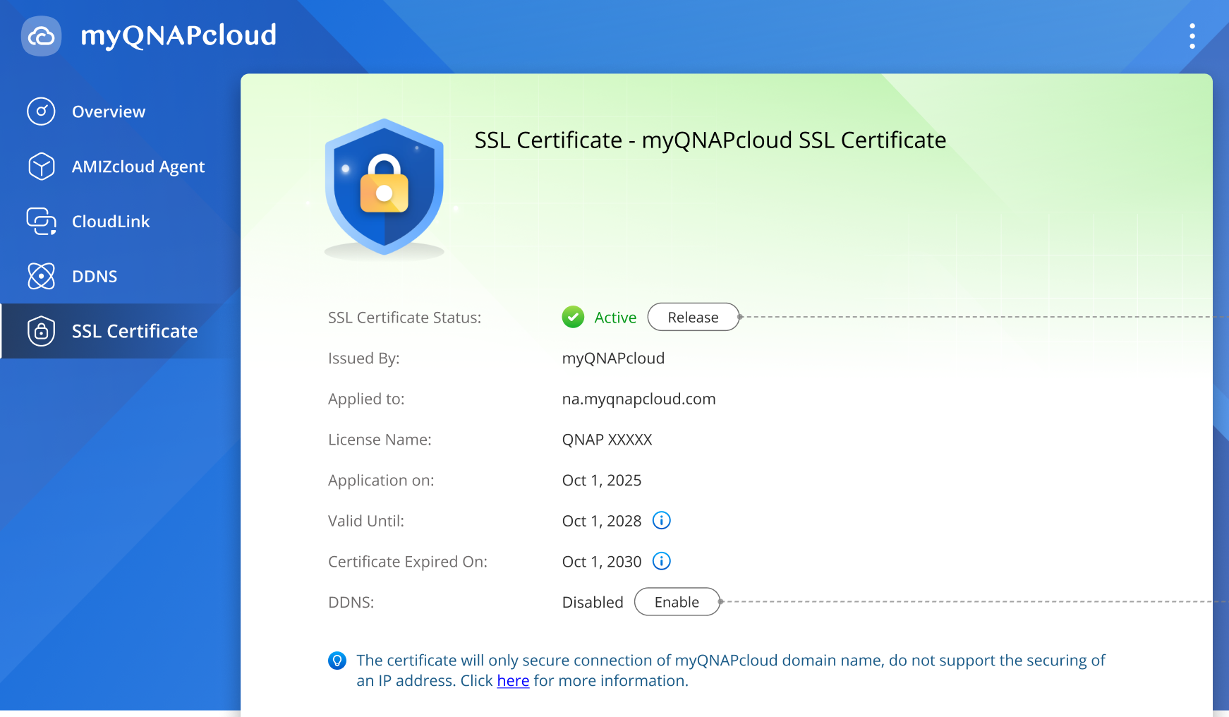 If your myQNAPcloud SSL certificate has been successfully installed, you will see the following information: