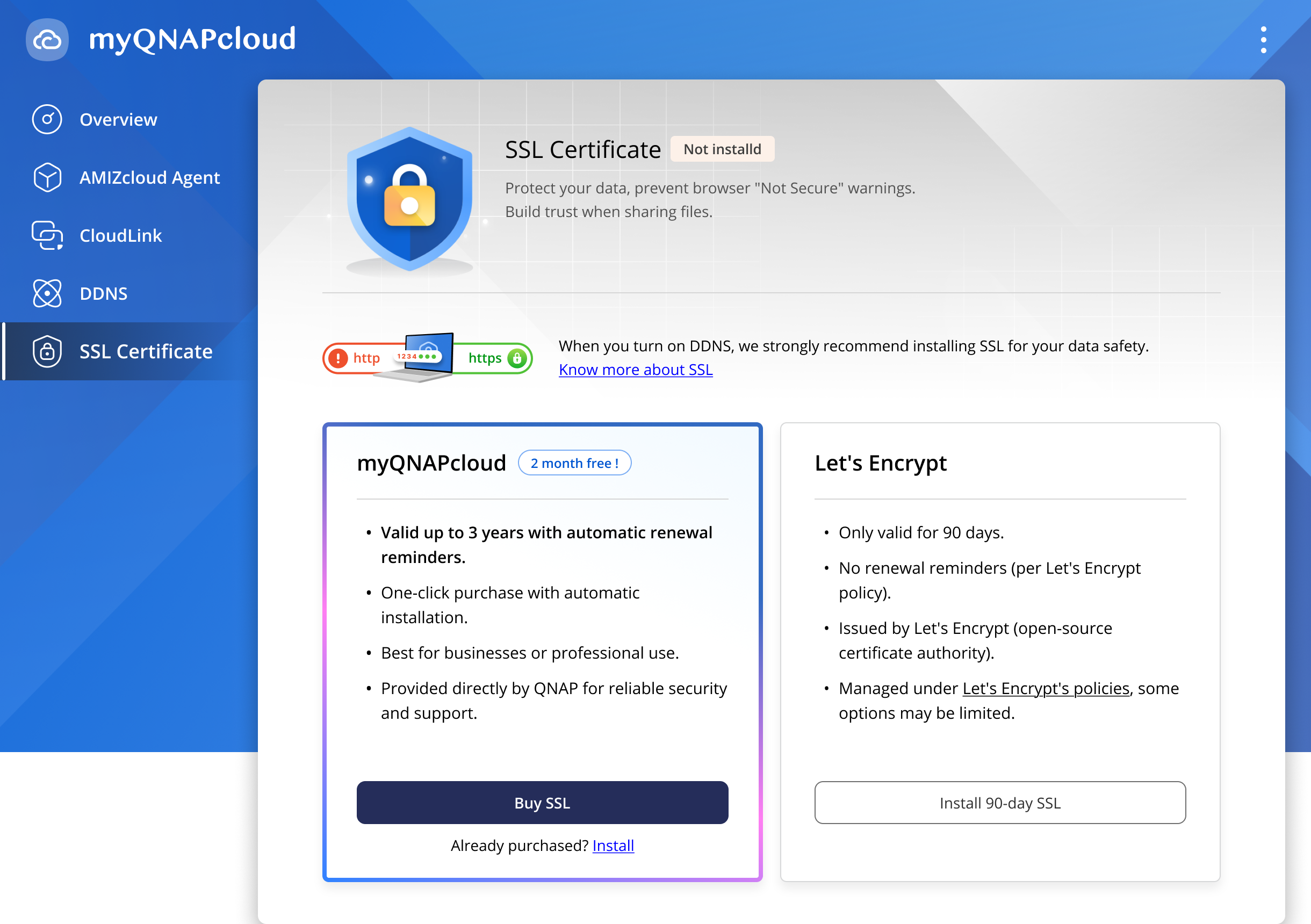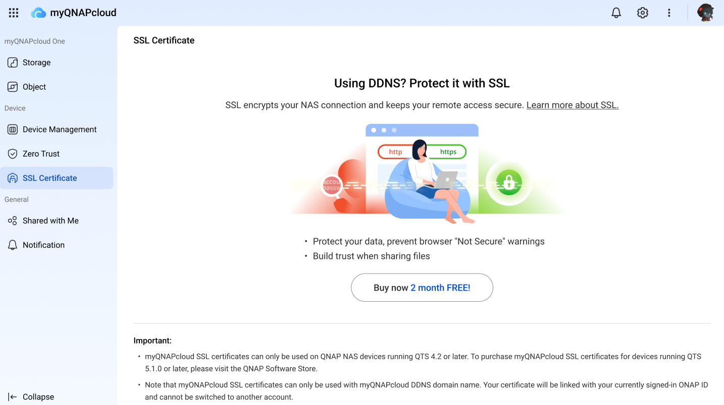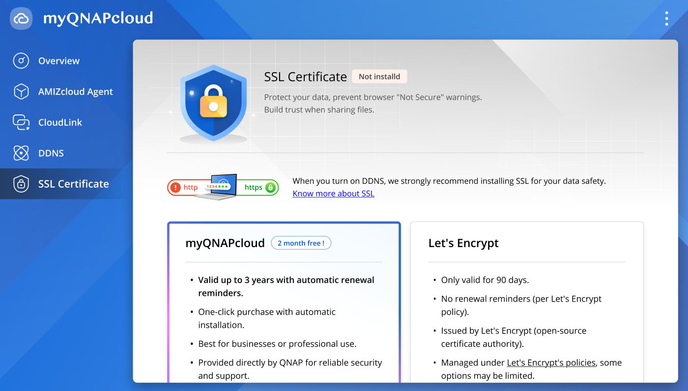 | QTS 4.2 - 5.0.1 | myQNAPcloud | You can purchase a certificate via the myQNAPcloud website, then install the certificate on the NAS. |