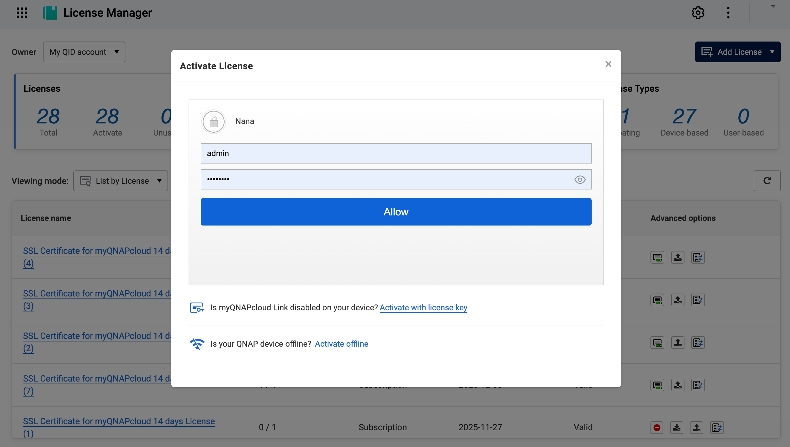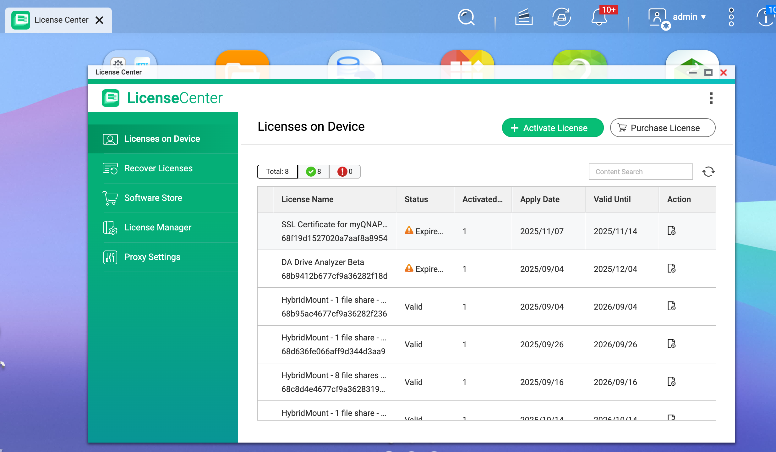 - On the NAS, go to License Center > Licenses on Device