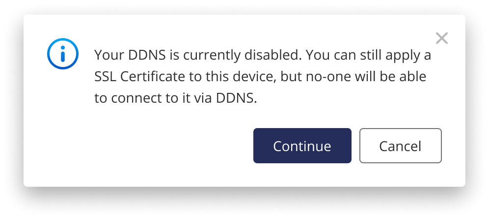 - 如果您的 DDNS 被禁用,您仍然可以安装 SSL 证书,但用户将无法通过 DDNS 使用它。点击 继续 或点击 取消并返回以启用您的 DDNS。