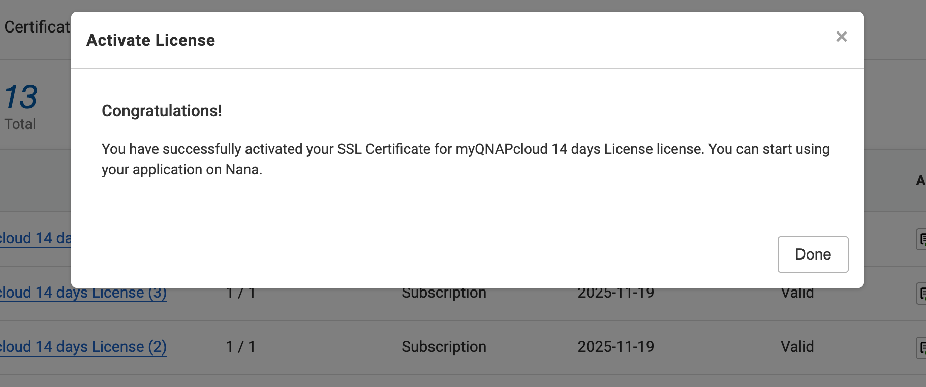 - 如果在您的 QNAP ID 下存在一个或多个有效的 SSL 证书,系统会显示许可证列表供您选择。