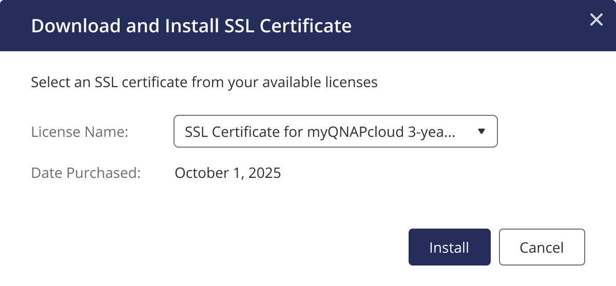 - Installation: After purchasing an SSL certificate with your myQNAPcloud account and successfully activating the license, you can install it directly on your NAS through the myQNAPcloud page.