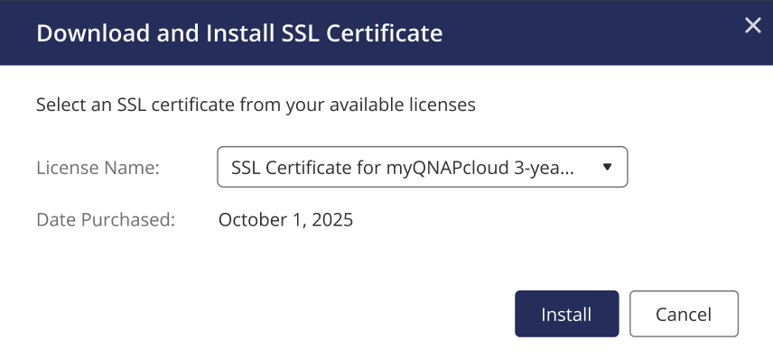After purchasing an SSL certificate using your myQNAPcloud account, you can install the certificate directly on your NAS. Note that your NAS must be linked to the same QNAP ID that was used for the purchase.