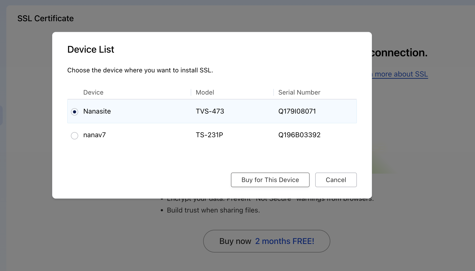 - If you have multiple devices: A list will appear. Select one NAS device, then click Buy for This Device to continue.