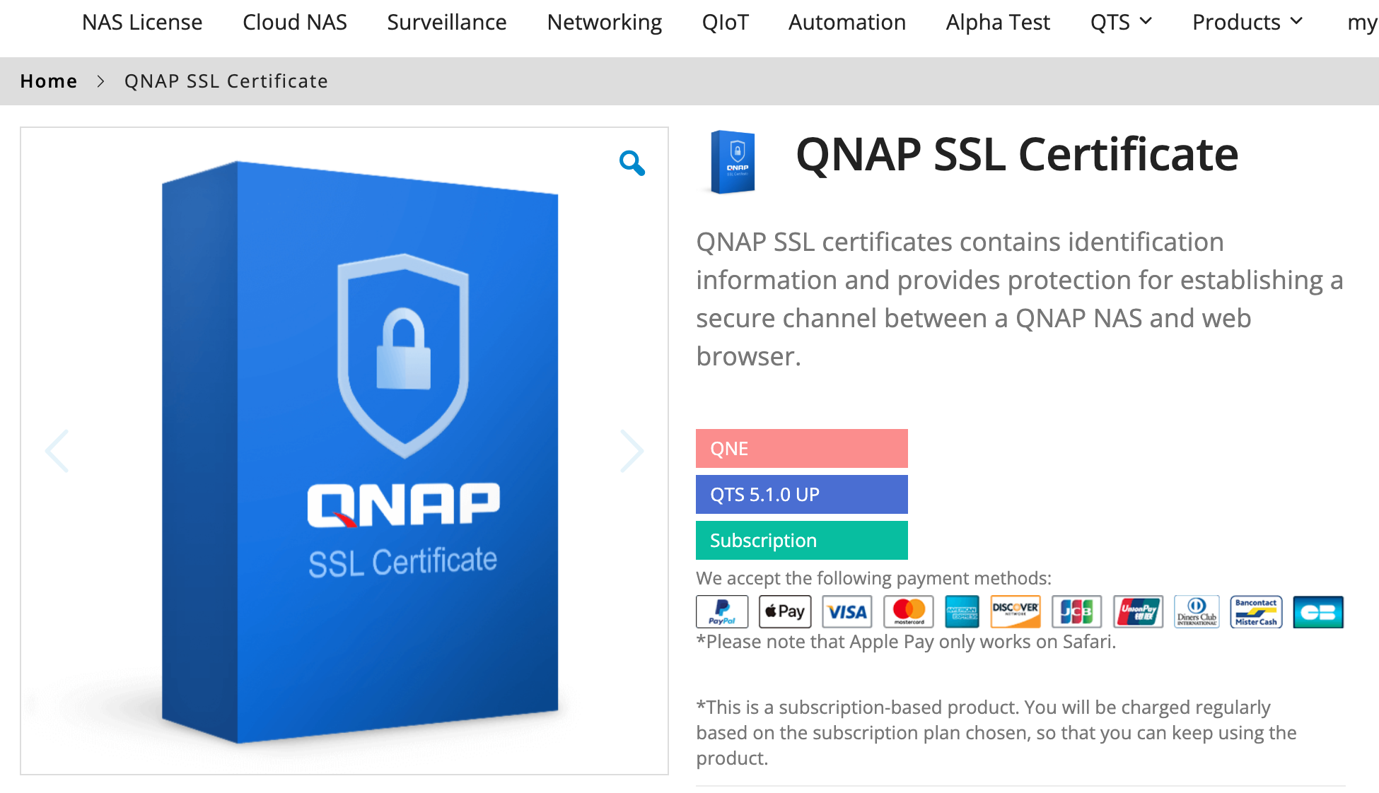| QTS 5.1.0 or later | myQNAPcloud Software Store | You can purchase a certificate via the myQNAPcloud website or in the QNAP Software Store. |