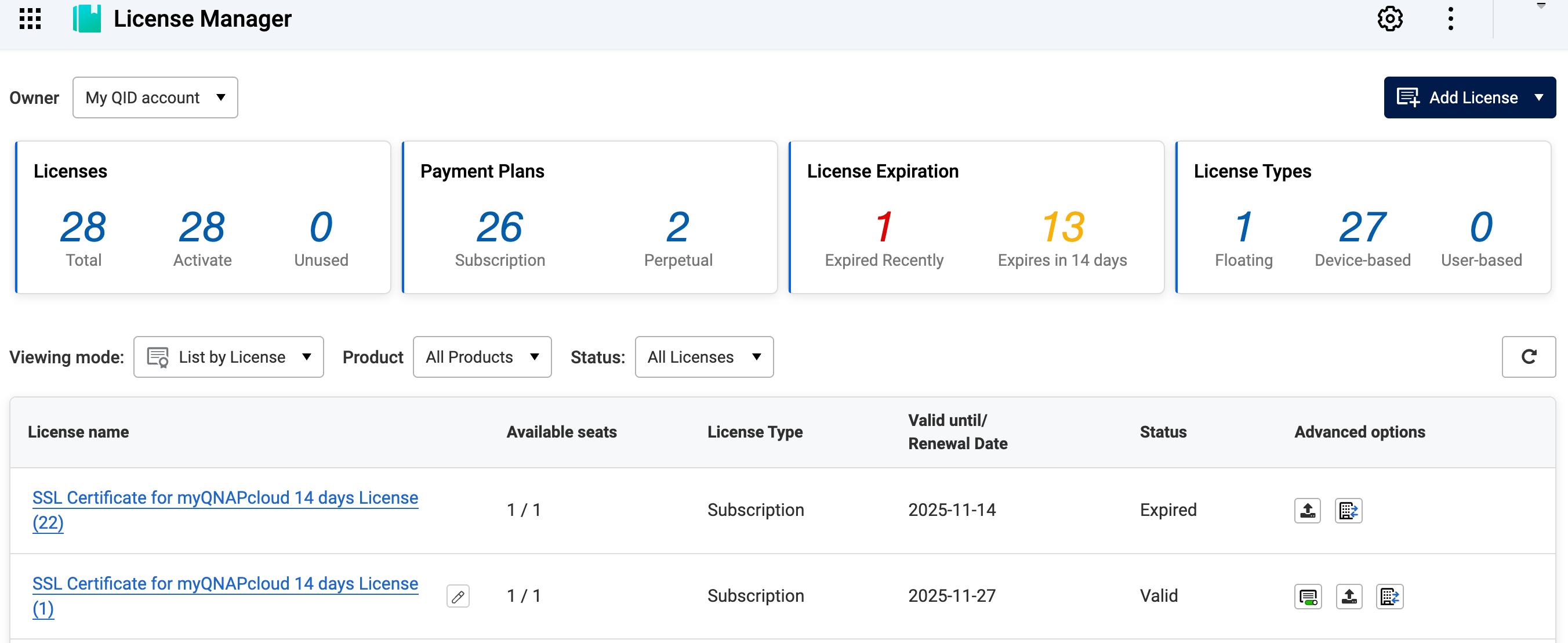 - From the license list, locate your SSL certificate license.