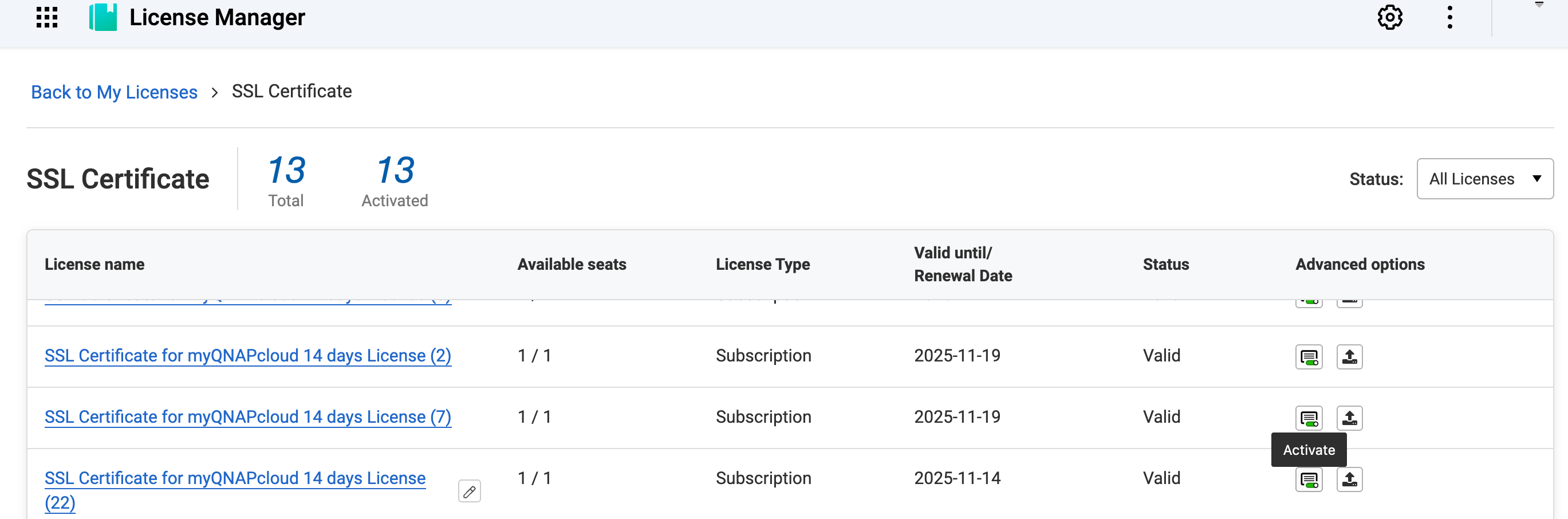 - 点击 激活在您想要激活的 SSL 证书许可证上。