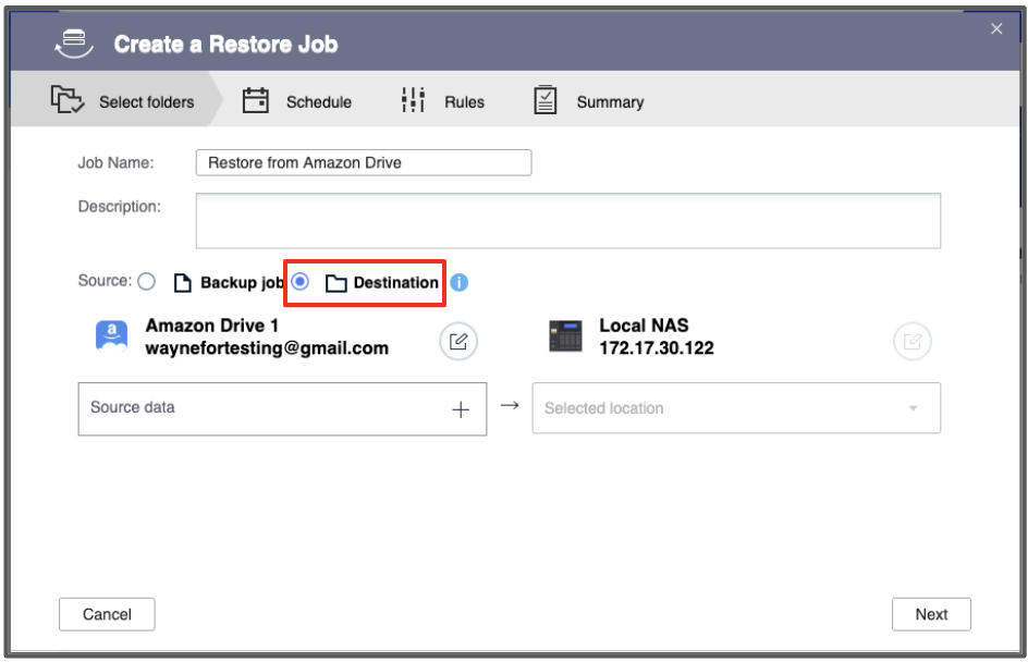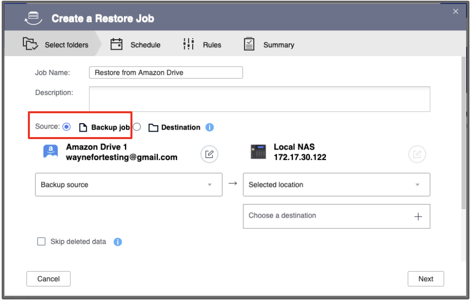 如果您曾使用 HBS 3 将 NAS 上的文件备份到 Amazon Drive,可以使用以下方法将这些文件从 Amazon Drive 恢复到 NAS:通过使用两种方法之一创建和运行恢复作业,即通过查找现有备份作业,或通过直接选择 Amazon Drive 作为目标存储空间。