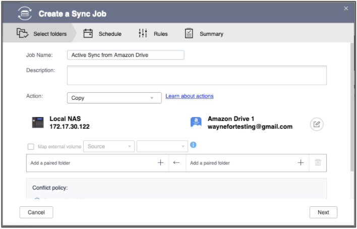 如果 Amazon Drive 上的文件比 NAS 上的文件更新,可以创建并运行活动同步作业,将这些文件的最新版本同步到 NAS。