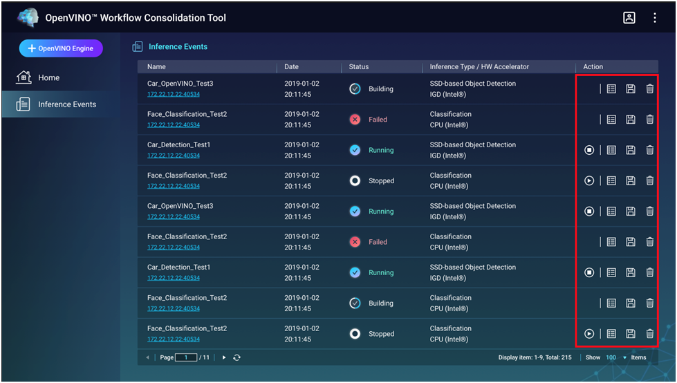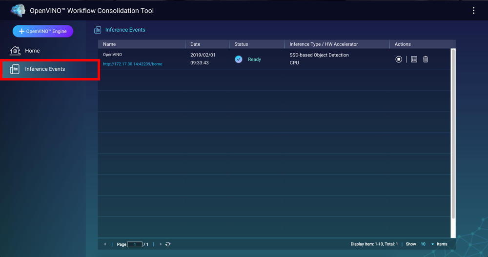 您可以在“Inference Events”(推理事件)屏幕上查看和管理推理引擎。