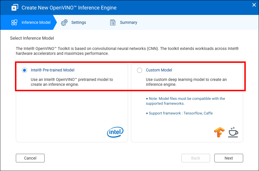 仅基于 Intel 的 NAS 型号支持 OpenVINO™ Workflow Consolidation Tool。 |