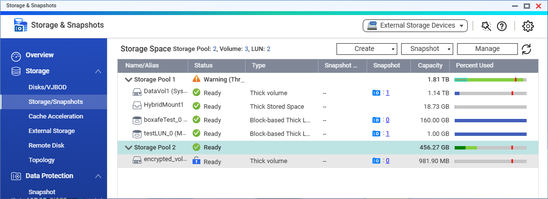 存储与快照总管是 QTS 中内置的一款实用工具,用于创建、管理和监控 QNAP NAS 上的存储空间。