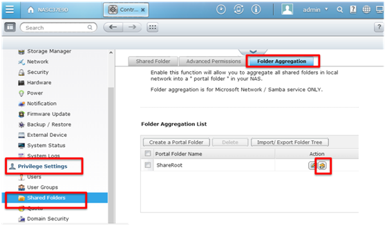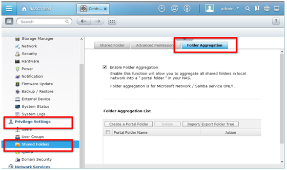 1. Login NAS web management interface. Go to “Privilege Setting”> "Share Folders" > "Folder Aggregation".