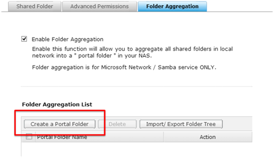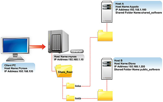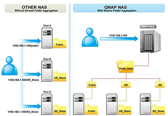 The Shared Folder Aggregation is used to build a hierarchical view of multiple file servers and shares on the network. This function can aggregate all shared folders in local network into a "portal folder" on our NAS. Instead of having to think of a specific machine name for each set of files, users can easily access all shared folders by accessing the "portal folder".