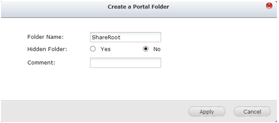 Click "Create A Portal Folder". A dialog box is displayed. Enter "ShareRoot" in the "Folder Name". Select not to hide the portal folder. Click "APPLY".