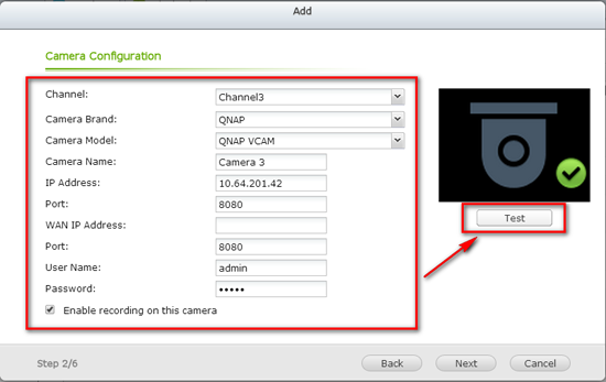 请依序输入下列摄影机设定。然后按[测试]按钮来确认Vcam摄影机与视频监控中心之间的联机。