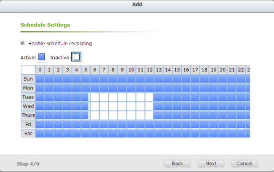 请按[下一步]至[排程设定]。在此,0~23代表每日之不同时段;分别代表:0~1时、1~2时...23~0时。在每个时段内,您可以将系统分别设定为连续录像、或不录像。