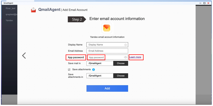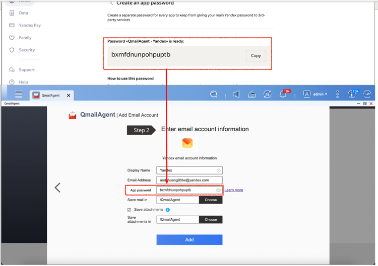You must create an app password for your Yandex email account before it can be added to QmailAgent.