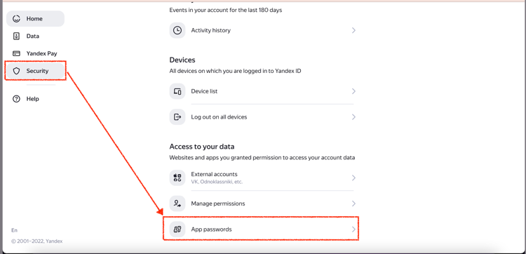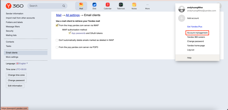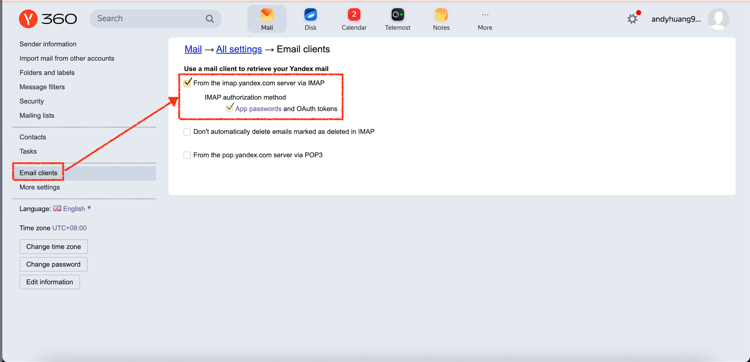 - Click Email clients and enable From the imap.yandex.com server via IMAP and App passwords and OAuth tokens.