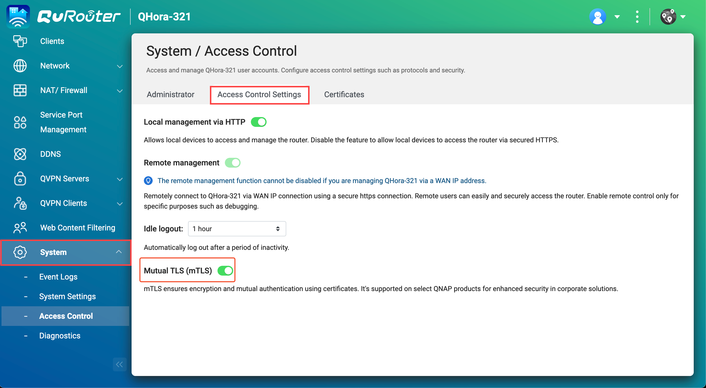 QuRouter 采用 mTLS 在服务之间建立安全通信,其包含加密和双向身份验证。此方法使用证书来提高企业网络内部的安全性,并帮助与 QNAP 产品(如与 Hybrid Backup Sync 配对的 Airgap+ 备份解决方案)集成。