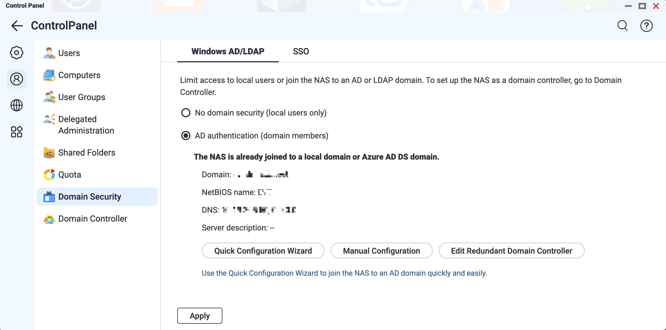 - Go to Control Panel > Privilege > Domain Security.