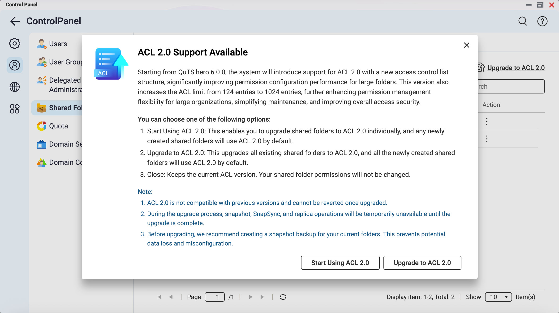 ACL 按共享文件夹逐一应用。用户可为每个文件夹选择使用的 ACL 版本,但一旦启用 ACL 2.0,无法切换回 ACL 1.0。