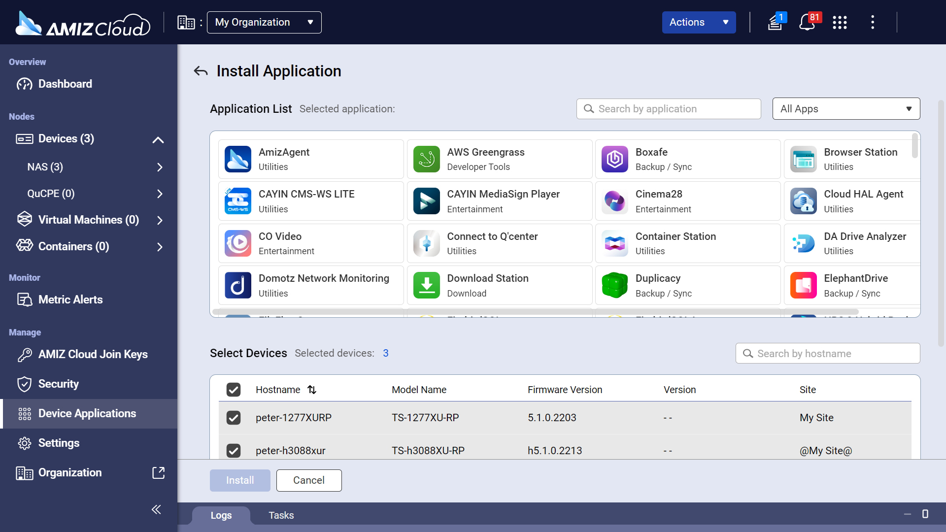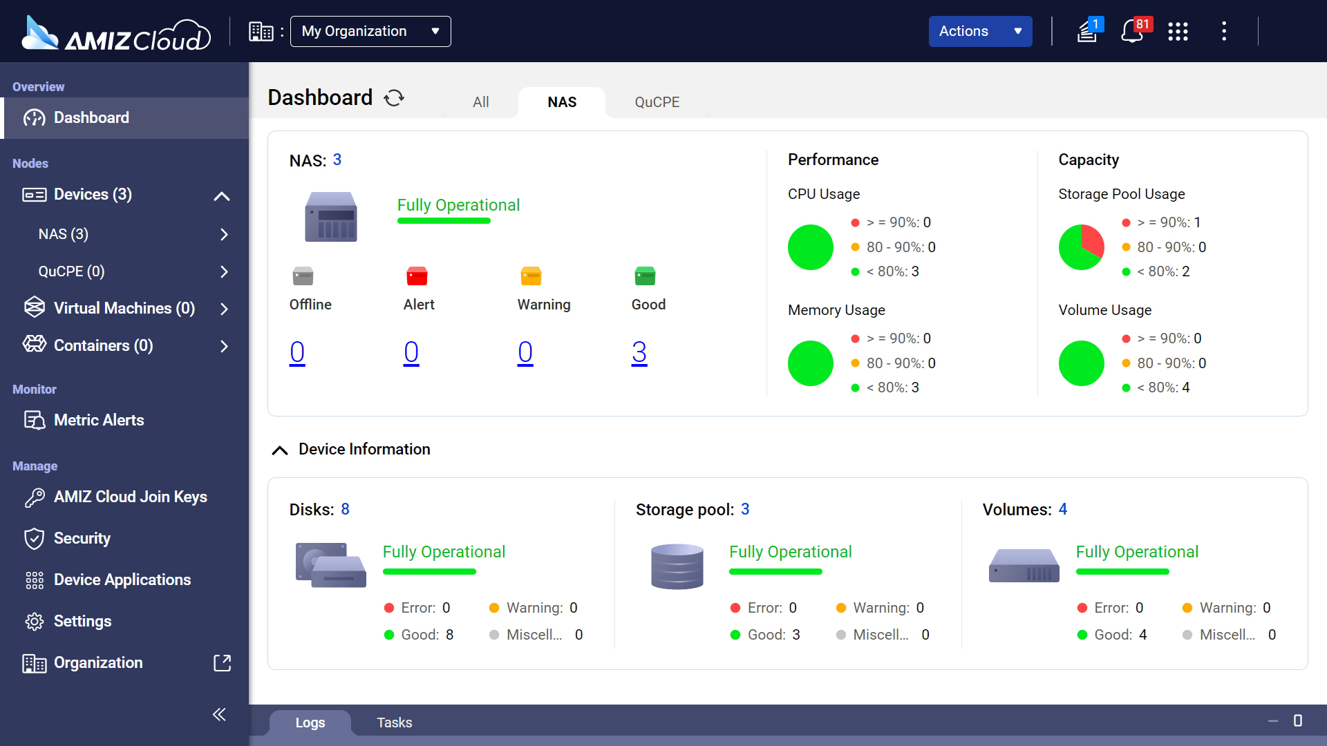 AMIZcloud 提供多方位的云端中控系统,管理员可由单一平台集中管理多台分散于各地的设备,尤其适合具有多分点的商务环境。现在,AMIZcloud 不仅可管理 QuCPE 网通虚拟化终端设备,也能远程监控 QNAP NAS。探索 AMIZcloud